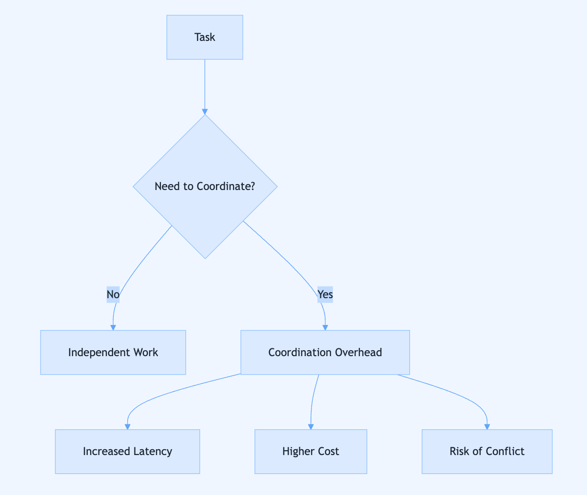 Whilst multi-agent systems offer powerful benefits like specialisation and parallelism, they introduce coordination overhead that grows exponentially rather than linearly—four agents require six communication channels, creating increased latency, higher costs, and new failure points that must be carefully managed.