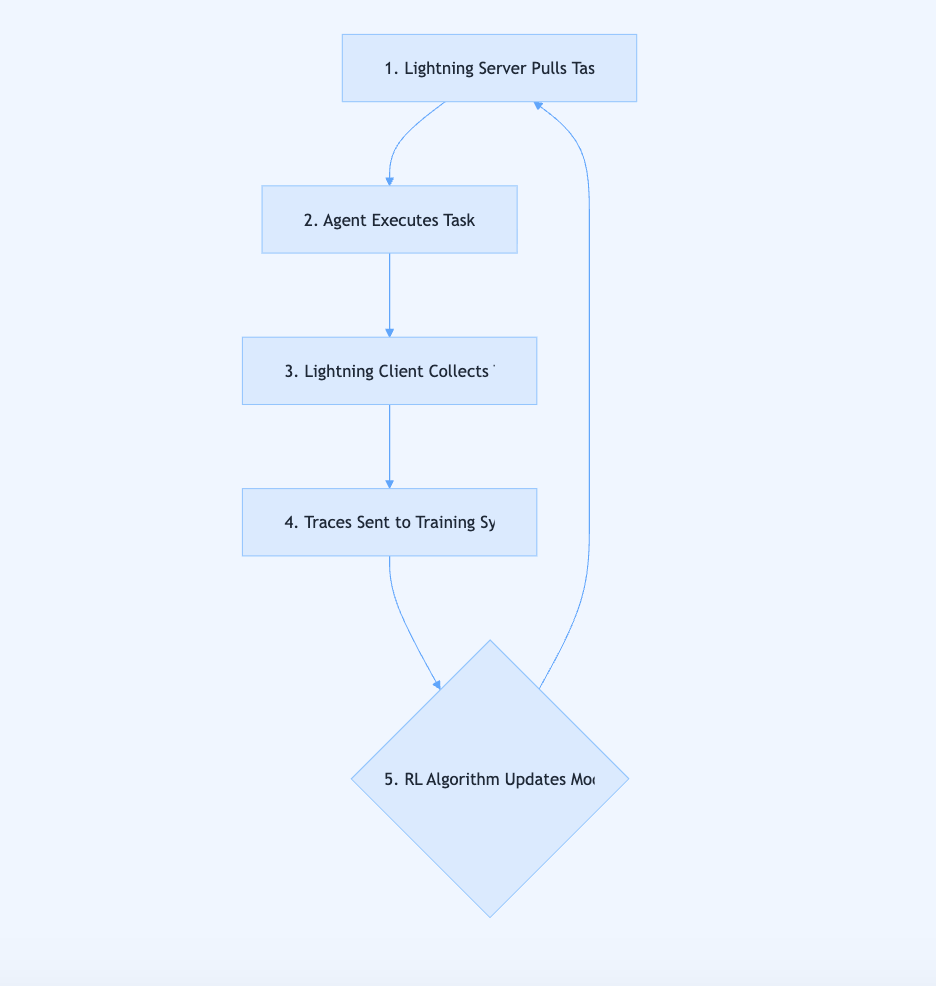 Agent Lightning introduces a decoupled architecture with a Lightning Server and Lightning Client that act as a middle layer between your agent and its underlying model, which means your existing agent code remains completely unchanged whilst a separate system observes every interaction and optimises the model.